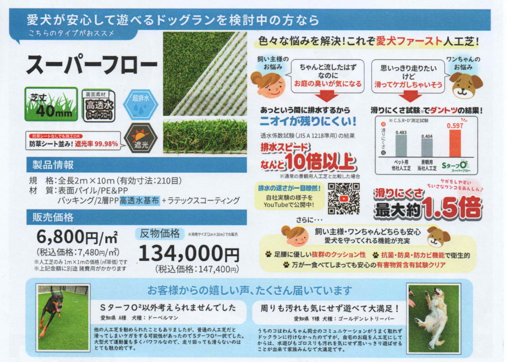 超排水スーパーフローを裏面に採用し、通常の人工芝の10倍の排水スピードを実現しました!